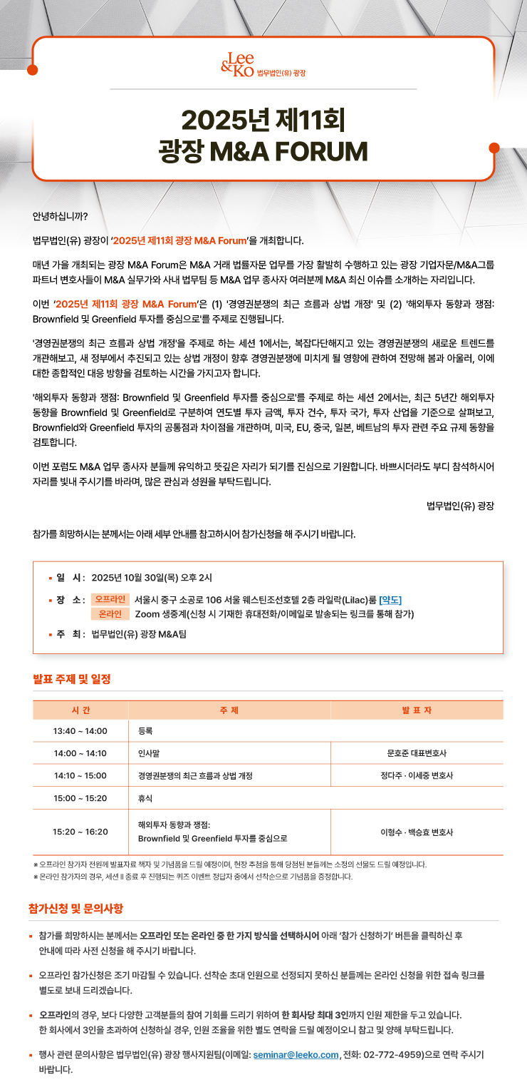 행사명2025년 제11회 광장 M&A FORUM - 온라인 참가신청페이지