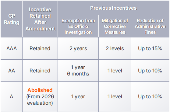 Before the amendment, incentives such as mitigation of corrective measures, reduction of administrative fines, and exemption from ex officio investigations were provided to all AAA, AA, and A-rated companies. Under the amended Competition CP Guidelines, benefits for A-rated companies will be abolished, and incentives will only be provided to AAA and AA-rated companies. However, given there is a grace period for policy changes, the abolished incentives for A-rated companies will apply starting from the 2026 Competition CP rating evaluation.
