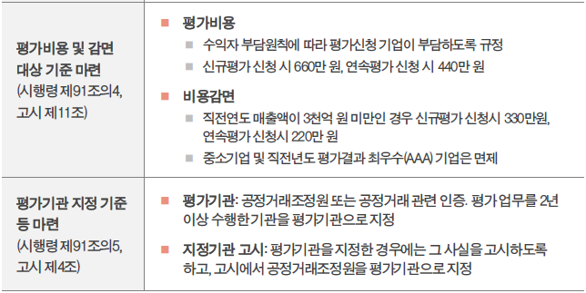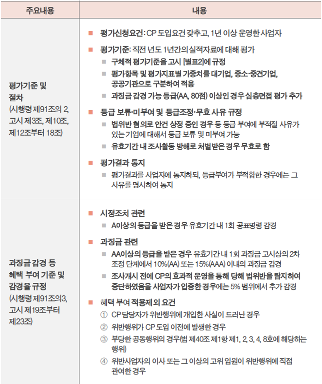 시행령 개정안은 (1) CP 평가 기준·절차, (2) 평가 등급 등에 따른 과징금 감경(20% 이내), (3) 평가기관(한국공정거래조정원 등) 지정 등을 주요 내용으로 하고 있으며, 고시 제정안은 (1) 구체적 평가 기준, (2) 평가 비용, (3) 과징금 감경 등의 기준·정도 등 CP 평가 및 유인부여 등에 필요한 세부사항을 규정하고 있습니다.
