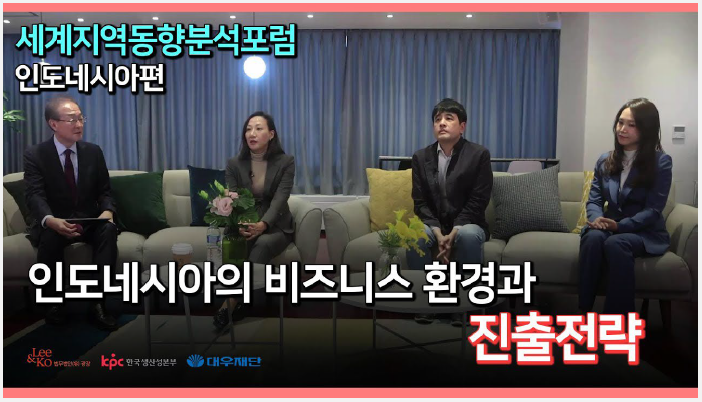 저희 법무법인(유) 광장 국제통상연구원은 한국생산성본부, 대우재단과 함께 세계 주요 지역을 선정하여 이들 지역에 대한 다양한 정보를 제공하기 위한 “세계 지역 동향 분석 포럼”을 영상으로 제작하게 되었습니다. 최근 중요성이 부각되고 있는 인도네시아 지역에 관한 국내 최고 전문가들을 초대하여 진행한 발표와 토론을 담은 영상을 배포해드립니다.