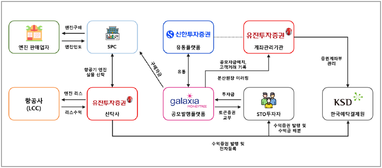 본건 혁신금융서비스는 갤럭시아머니트리가 SPC를 통하여 항공기 엔진 실물을 매입하고, 이를 신탁업자에 신탁하여 신탁수익증권을 전자등록 방식으로 발행한 후, 해당 증권을 유통 플랫폼을 통해 투자자에게 유통하는 서비스입니다.