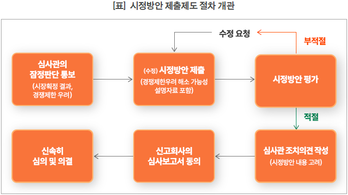 ■ 심사보고서 작성: 심사관은 시정방안이 적절하다고 판단할 경우, 시정방안의 내용을 고려하여 시정조치에 관한 의견을 작성합니다. 이때 신고회사가 제출한 시정방안은 심사보고서에 첨부합니다 (운영고시 제14조, 제15조).