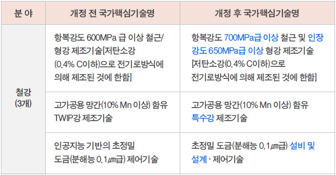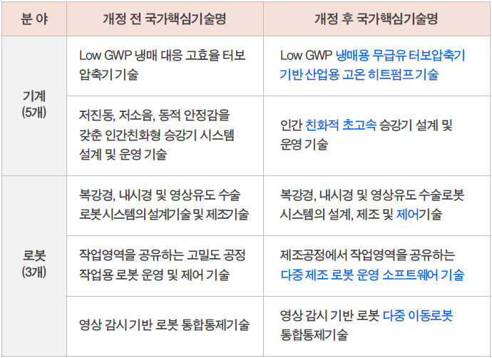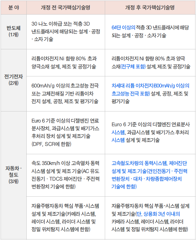 기술 범위를 명확하게 하기 위하여 반도체, 전기전자, 자동차 등 총 8개 분야 24개 기술의 기술명이 변경되었습니다. 그동안 관련 기술 분야 업계에서 기술 명칭이 모호하다는 의견이 지속적으로 제기됨에 따라 이를 반영하여 기술명을 변경한 것입니다.