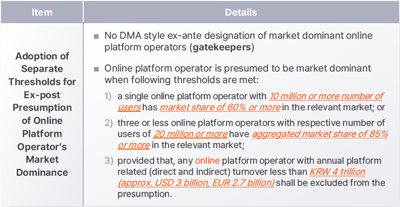 Furthermore, as the “less than KRW 4 trillion” threshold may allow most of online platform operator to avoid the presumption of market dominance (as for domestic platform operators, only 3-4 online platform conglomerate would be captured), the regulation under the new roadmap may also not be as effective as it intended to be.