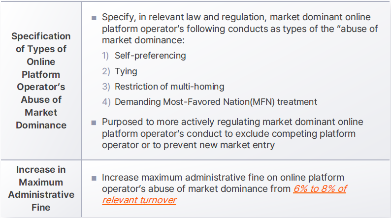 In the new roadmap, the KFTC proposed the amendment of the MRFTA, the prime antitrust/competition law in Korea, to regulate anticompetitive conducts of market dominant online platform operators. Major amendments proposed by the KFTC are as follows: