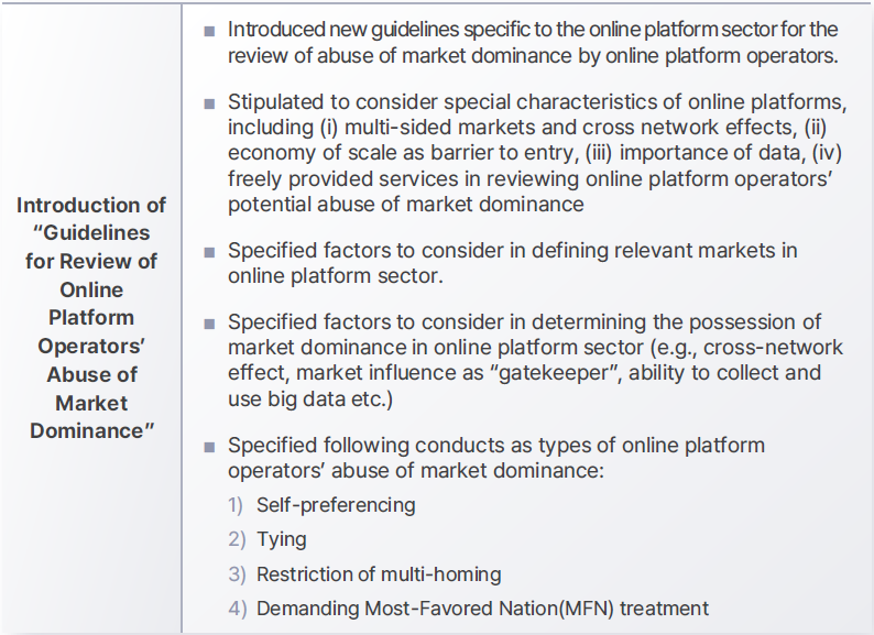 While the KFTC was already able to regulate online platform operators’ abuse of market dominance with regulations in the MRFTA, the KFTC aimed to expedite and streamline the investigation process in online platform sector by avoiding tedious process of defining a relevant market through economic analysis.