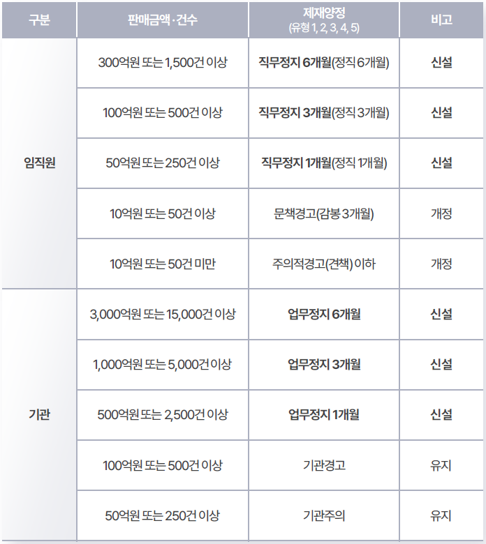 기존 임직원 3단계, 기관 2단계로 구분되어 있던 판매 금액·건수 기준을 임직원 5단계, 기관 5단계로 세분화하였습니다. 나아가 임직원 직무 정지(정직) 및 기관 업무 정지의 구체적인 기간(1~6개월)을 구간별로 차등화하는 방식으로 개정되었으며, 그 세부적인 기준은 아래와 같습니다.