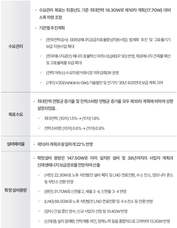 전력수급기본계획(이하, 계획)은 향후 15년간의 전력수급의 기본 방향, 전력수급의 장기 전망, 전력수요의 관리에 관한 사항 등 전력정책의 기본적인 방향과 내용을 담는 계획으로 2년마다 수립됩니다(전기사업법 제25조, 시행령 제15조). 금번 제11차 계획은 2024년 5월 말 실무안 공개를 시작으로 2024년 9월 공청회 개최 등의 의견수렴 절차를 거친 후, 국회 상임위 보고(25. 2. 19.) 및 전력정책심의회(25. 2. 21.) 논의를 거쳐 최종적으로 확정되었는바, 이에 대한 주요 내용을 아래와 같이 소개드립니다.