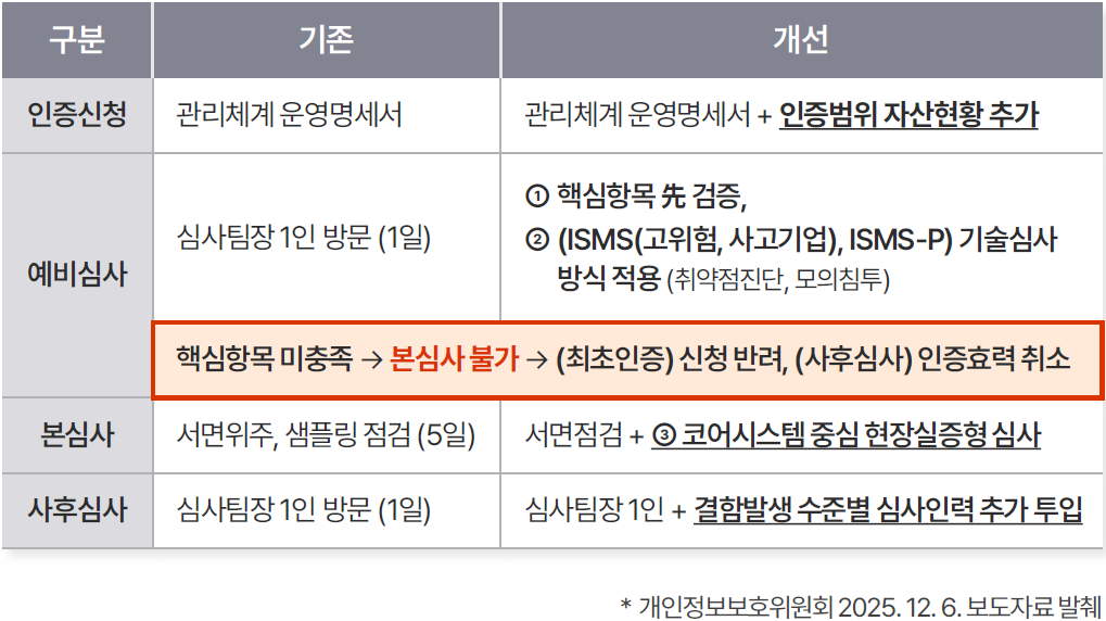 예비 심사는 인증 심사 계약 체결 전 심사 팀장이 신청 기관을 방문하여 인증 심사에 필요한 기초 자료 구비 유무, 인증 심사 준비 상태 및 운영 여부 등을 예비적으로 확인하는 단계입니다. 본건 개편안은 향후 예비 심사 단계를 보다 실질화하는 것을 내용으로 하는바, i) 예비 심사 단계에서 핵심 항목을 사전에 검증하게 하고, ii) 핵심 항목을 충족하지 못한 경우 인증 신청을 반려할 수 있게 하며, iii) ISMS(고위험·사고 기업) 및 ISMS-P 인증 대상 기업에 대해서는 취약점 진단, 모의 침투 등 기술 심사 방식을 적용하게 할 예정입니다.
