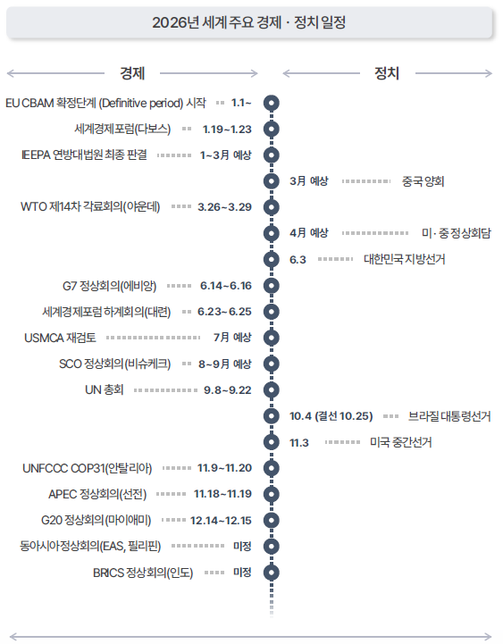(미국 트럼프 노믹스 강화와 그 후유증) 2026년 미 트럼프 행정부의 경제·통상 정책은 국내 정치 일정과 결합된 전략적 보호주의로 더욱 강화될 것이다. 11월 중간 선거를 앞두고 관세 인상과 수입 규제 등 가시적 정책 수단이 선호될 가능성이 크며, 행정부의 재량적 조치를 통해 차별적인 국가별, 산업별 조치를 취할 가능성이 높다. 미국은 관세를 무기로 상대국을 압박하여 체결한 17여 개의 양자 협정을 기반으로 소위 턴베리 체제(Turnberry System)를 확대해 나갈 것이다. 특히 한·미 간 투자 MOU 및 팩트 시트에 따른 대미 투자와 무역 합의가 이행됨에 따라, 그 이행 과정을 미국의 여타 국가와의 합의 이행 동향과 함께 모니터링할 필요가 있다. 아울러 트럼프 노믹스는 단기적 산업 보호 기대와는 달리 중장기적으로 통상 마찰 격화, 공급망 왜곡, 정책 불확실성의 상시화를 초래할 우려가 크기 때문에 그 누적적 파급 효과에 대비해야 한다.