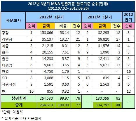 연합인포맥스가 27일 발표한 '2012년 3분기 자본시장 리그테이블' M&A법률자문(화면 8460) 완료기준(Completed) 실적에서 광장은 15조3천866억원(12건)을 자문해 높은 자리에 올랐다.